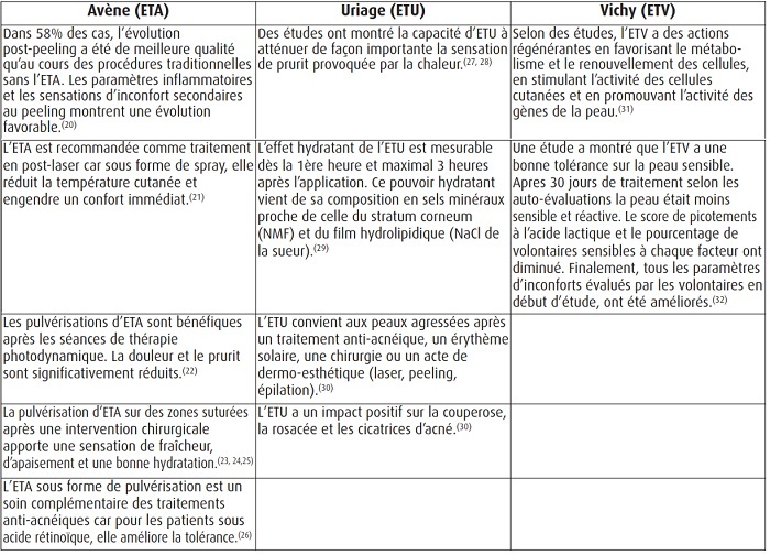 L’utilisation des eaux thermales fait partie intégrante des thérapeutiques efficaces dans la prise en charge de la peau suite à un acte de médecine esthétique. Les eaux thermales offrent des spécificités cicatrisantes, anti-inflammatoires, anti-irritantes, pour accompagner les traitements invasifs (peelings, laser, resurfacing, thérapie photodynamique …). Les sprays et les produits cosmétiques à base d’eaux thermales sont donc indiqués pour les peaux sensibles ou comme accompagnement de traitement médicamenteux ou d’actes médicaux.