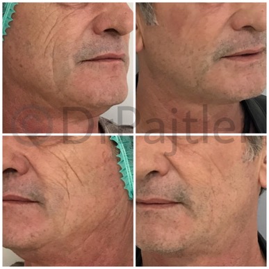 Sur l’exemple suivant, les paramètres utilisés ont d’emblée été élevés car cet homme ancien fumeur et longtemps exposé au soleil, présentait des rides profondes et un tissu cutané épais. Une seule séance sépare ces clichés.