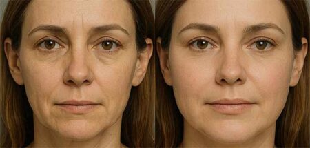 Peau traitée après une couverture HIFU de 32% avec 4.5 mm de profondeur et de 5% à 3 mm de profondeur (photo A) et 60% à 4.5 mm et 7% à 3 mm (photo B)
